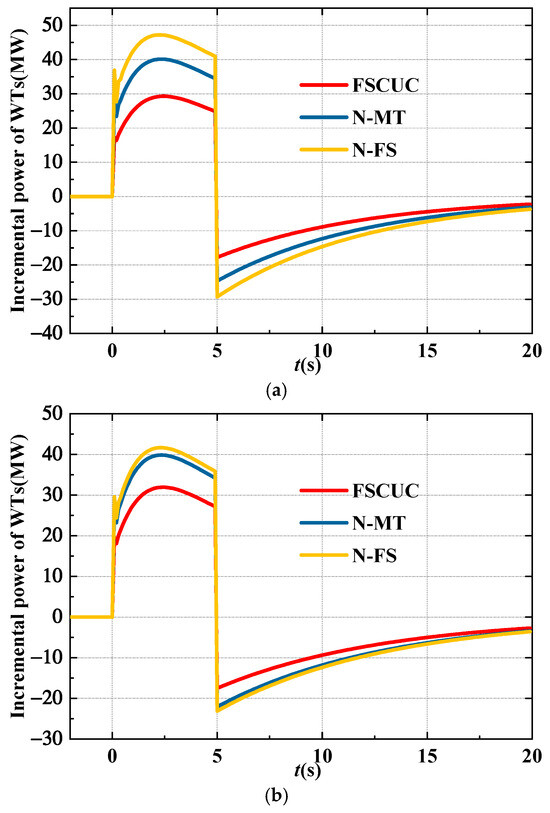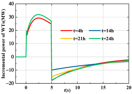 Moreover, the frequency dynamics and WT power output are provided in Figure 6 and Figure 7, respectively, to clarify the control mode transition. During the FR mode (0~5 s), WTs increase the power output through the ROCOF loop and droop loop in Equation (1) to alleviate the frequency drop. Subsequently, the FR mode is terminated, and the MPPT mode is activated at to ensure the stability of WTs and restore the rotor speed. In this case, the power outputs of WTs decline significantly, causing the severe second frequency, reaching to the , as shown in Figure 6. Therefore, the necessity to involve the control mode transition into the UC model is highlighted, and the effectiveness of the proposed can be validated.