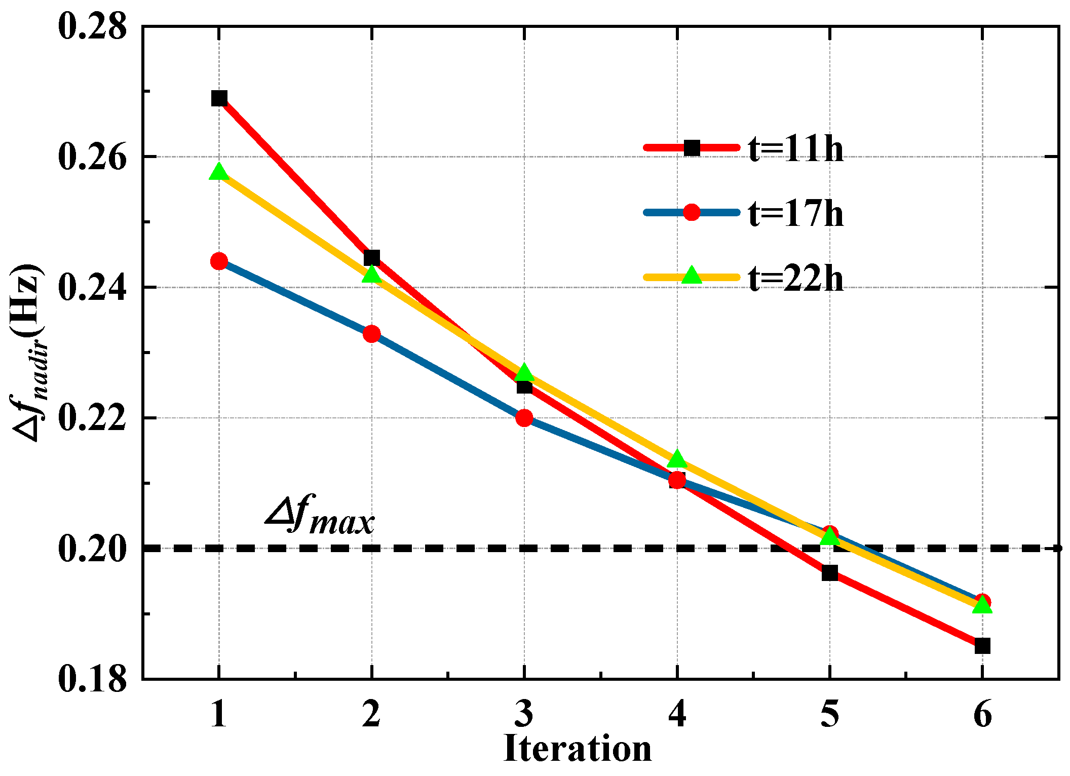 The effectiveness of the PII-based solution algorithm is demonstrated, and the convergence behaviors and the evolution of the frequency–instability periods are shown in Figure 14 and Table 7, respectively. Moreover, a comparison of the computation time between the proposed and direct solution method is shown in Table 8. It can be seen that the proposed method can converge within six iterations, spending 5 min, and both the frequency index and frequency–instability periods can be reduced effectively. In contrast, the direct solution method is unable to converge to a feasible solution within 10 h due to the high-dimensional characteristic of the FSCUC model.