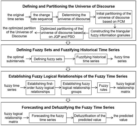 The fuzzy time series forecasting model usually contains four basic steps: (1) defining and partitioning the universe of discourse; (2) defining fuzzy sets and fuzzifying historical time series; (3) establishing fuzzy logical relationships of the fuzzy time series; (4) forecasting and defuzzifying the fuzzy time series. Utilizing the optimal partitioning results of the universe of discourse from Section 3, the framework for fuzzy time series forecasting is presented in Figure 3.