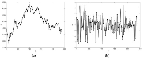 where R(t) denotes the rate of change of the stock index on the t-th trading day, x(t) is the stock index at the current moment, and x(t − 1) is the stock index at the previous moment.