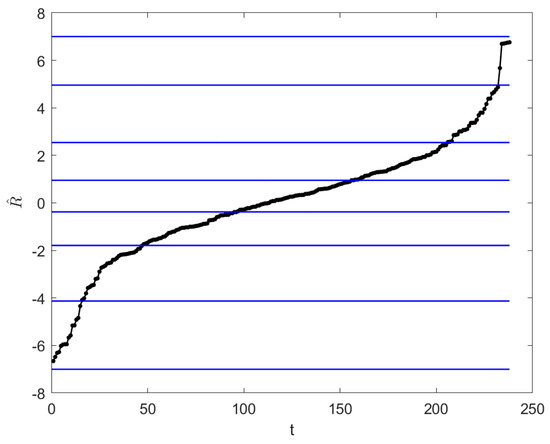 Given a time series dataset , we define and . Let denote the universe of discourse, l1 and l2 are called trimming factors, which are two appropriate positive numbers. Assume the universe is partitioned into p intervals (typically p > 2). We utilize the FCM method on the time series X to obtain the cluster prototypes V of the universe of discourse, which are denoted as the clustering centers. Then, we arrange these clustering centers in ascending order and calculate the medians of two adjacent clustering centers as the boundary values of the subintervals of the partitioned universe of discourse as follows:
