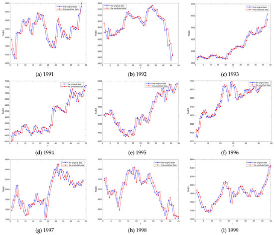 Table 11 presents the RMSE comparison of the proposed model in this paper with other representative prediction models on the TAIEX datasets from 1991 to 1999. Among them, AR(1) and AR(2) [44] are classic time-series prediction models. Chen [45] introduced a traditional fuzzy time-series prediction model. Huarng [46], Yu [47], and Huarng and Yu [48] focused on partitioning the universe of discourse and determining sub-interval lengths to enhance prediction accuracy. Chen and Wang [49] emphasized extracting more effective fuzzy logical relationships from time series. Chen and Chen [50] concentrated on multi-factor fuzzy time-series prediction models using various strategies. Wang [51] developed several fuzzy theory-based time-series prediction models, including models based on automatic clustering and axiomatic fuzzy sets, trend prediction and autoregressive models, and fuzzy data mining.