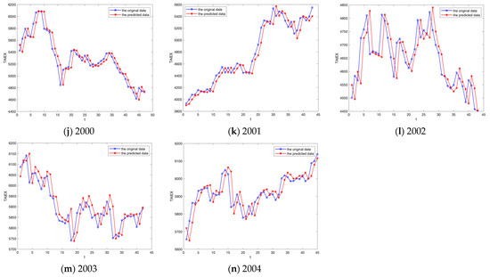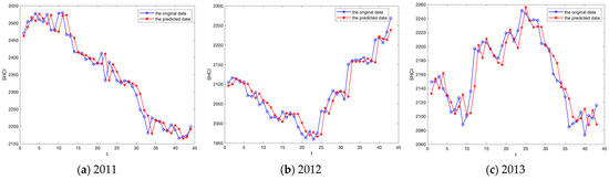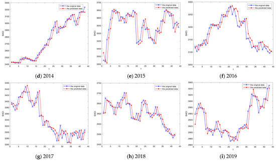 Figure 11 clearly shows that the trend of the predicted values generated by the proposed model aligns closely with the direction of the original datasets. We calculate the RMSE of the prediction results of SHCI from 2011 to 2019, as shown in Table 15, and the average RMSE value is 29.69.