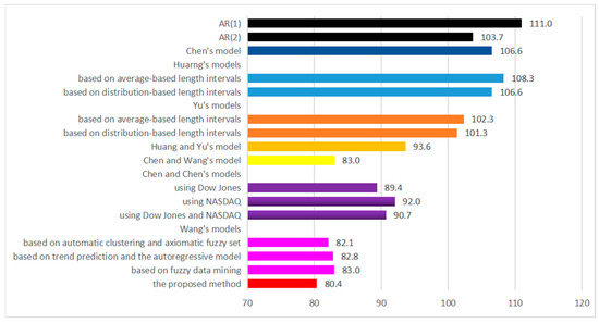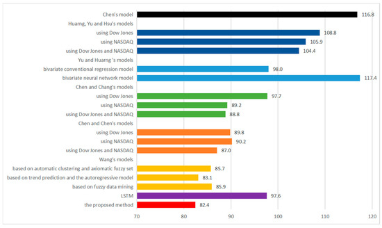 As shown in Figure 10, the proposed model achieves an average RMSE value of 82.4, which is the lowest among all the prediction methods, indicating the highest prediction accuracy. Compared with Chen’s model [45]; Huarng, Yu, and Hsu’s model [52]; Yu and Huarng’s model [53]; Chen and Chang’s model [54]; Chen and Chen’s model [50]; Wang’s model [51]; and LSTM [9], the proposed model in this chapter has an absolute advantage in prediction accuracy.
