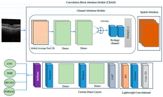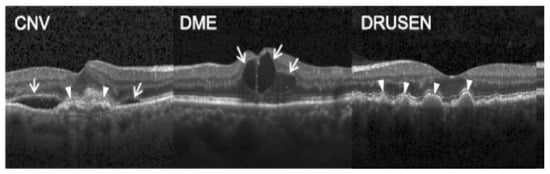 Elkholy, M. et al. [26] proposed a DL algorithm that detected three different diseases by extracting features from OCT images. The DL algorithm employed a CNN to classify OCT images into four categories: normal retina, DME, choroidal neovascularization (CNM), and age-related macular degeneration (AMD). The study utilized publicly available OCT retinal images as its dataset. The experimental results demonstrated a significant improvement in classification accuracy, achieving 97% while detecting features of the three specified diseases.