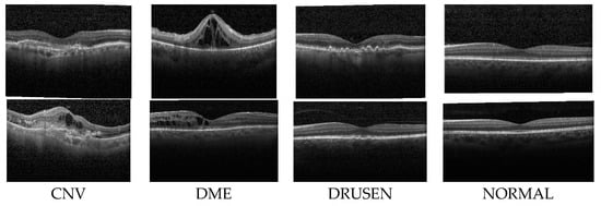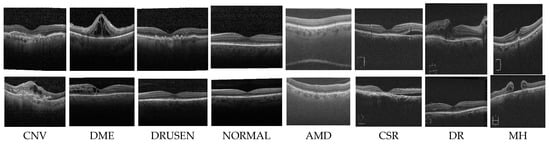 The OCT-C8 dataset includes 24,000 images divided into eight different categories: AMD, CNV, central serous retinopathy (CSR), DME, diabetic retinopathy (DR), drusen, macular hole (MH), and normal. Each category contains 2300 images designated for training, 350 for validation, and 350 for testing, as shown in Table 3 and Figure 5. The maximum resolution of the OCT images is 384 × 496 pixels, while the minimum resolution is 1536 × 496 pixels [34].