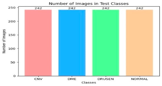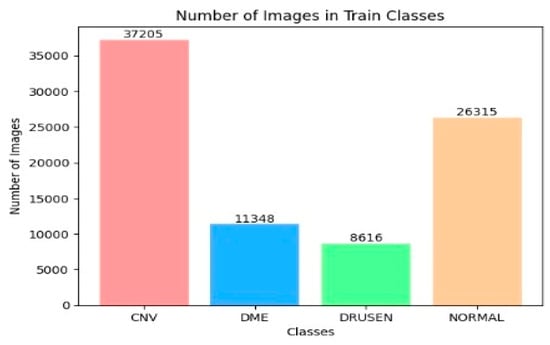 OCT-2017 images, specifically from the Spectralis OCT system by Heidelberg Engineering in Germany, were collected from retrospective groups of 4686 adult patients. These patients were sourced from various institutions, including the Shiley Eye Institute at the University of California, San Diego, the California Retinal Research Foundation, Medical Center Ophthalmology Associates, Shanghai First People’s Hospital, and Beijing Tongren Eye Center. The data collection period spanned from 1 July 2013 to 1 March 2017 [4]. Before the training phase, each image went through a comprehensive grading system that involved multiple layers of trained graders with increasing levels of expertise for validation and correction of image labels. Initially, every image added to the database was labeled based on the most recent diagnosis of the patient. The first level of grading involved undergraduate and medical students who had completed an OCT interpretation course. These graders conducted initial quality control, removing OCT images that had severe artifacts or significant reductions in image quality. The second level consisted of four ophthalmologists who independently assessed each image that had successfully passed the first level. They recorded the presence or absence of CNV (whether active or in the form of subretinal fibrosis), macular edema, drusen, and other identifiable pathologies in the OCT scan. Finally, the third level included two senior independent retinal specialists, each with over 20 years of clinical experience in retina, who verified the accuracy of the labels for every image. To prevent data leakage, we conducted patient-level splits so that no patient appears in more than one of the training, validation or test subsets. We further stratified sampling by both disease class and acquisition site to maintain consistent prevalence across splits. To reduce human error in grading, a validation subset of 993 scans was evaluated separately by two ophthalmologist graders, with any discrepancies in clinical labels resolved by a senior retinal specialist [33]. The OCT-2017 dataset consists of 84,484 images in JPEG format, categorized into four groups: normal, CNV, DME, and drusen, as shown in Table 2 and Figure 2. The distribution of the training and test sets is shown in Figure 3 and Figure 4.