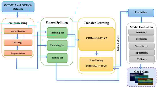 To detect EDs from images, we developed a model named CDResNet101-V2, which was a 2D single-channel CNN utilizing ResNet101-V2. This model leveraged the capabilities of DNNs specifically for ED detection. Our research concentrated on the initial layers of the ResNet101-V2 model. Additionally, it optimized the diagnostic process with the goal of reducing both time and costs for patients. Furthermore, the proposed model utilized the Grad-CAM technique to pinpoint specific areas impacted by GGOs related to EDs. We conducted two experiments using two OCT datasets for multiclass classification tasks, consisting of four and eight classes, respectively. The data underwent pre-processing methods including data augmentation, resizing, and normalization to ensure consistent input. The architecture of the proposed DL model is illustrated in Figure 6, while Algorithm 1 outlines the algorithm used for fine-tuning the six DL models. The steps of the proposed DL model are detailed as follows: