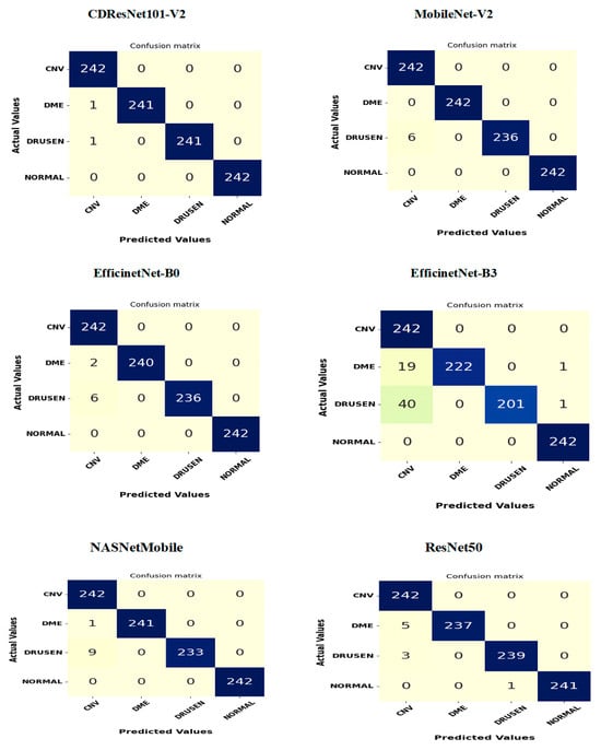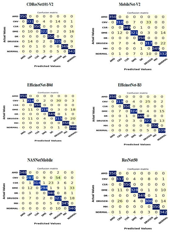 Phase 5 (Multiclassification using the 6 DL Models): The six DL models were employed to carry out multiclass classification on the two OCT datasets. Furthermore, the performance of our proposed DL approach was evaluated using the specified metrics.