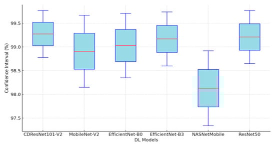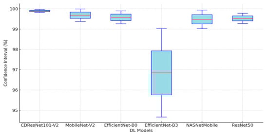 In summary, CDResNet101-V2 and ResNet50 distinguished themselves with exceptional upper bounds and narrow intervals, signifying highly consistent and reliable performance. Conversely, NASNetMobile exhibited the lowest and most variable range, highlighting its comparatively weaker consistency.