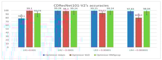 CDResNet101-V2’s accuracies with three optimizers and four LR values.