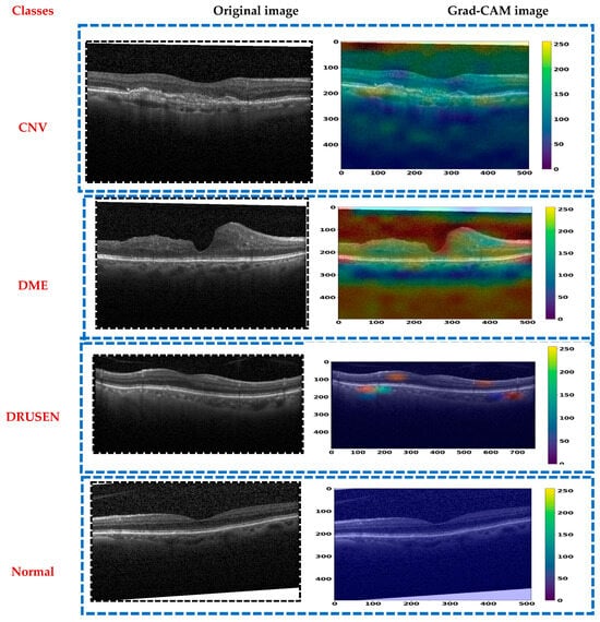 The Grad-CAM outputs for all classes show focused attention that corresponds with clinically significant retinal asymmetries, which supports the model’s interpretability. This connection between the model’s focus and recognized pathological areas increases confidence in its decision-making for the automated classification of retinal diseases.