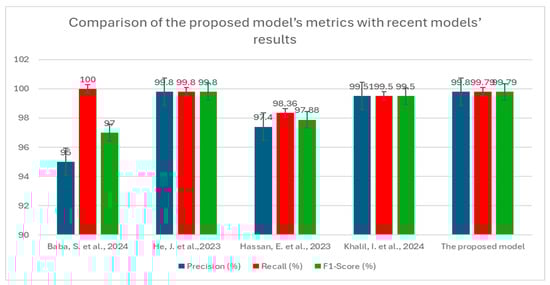 Comparison of the proposed model’s metrics with recent models’ results of [24,29,30,32].