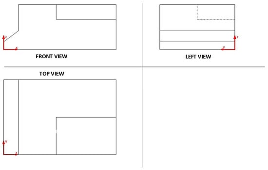 It is assumed that the 2D workshop drawing is complete and contains three orthographic projections made according to ISO-E or European projection layout: front view, top view, and left view, as shown in Figure 2.