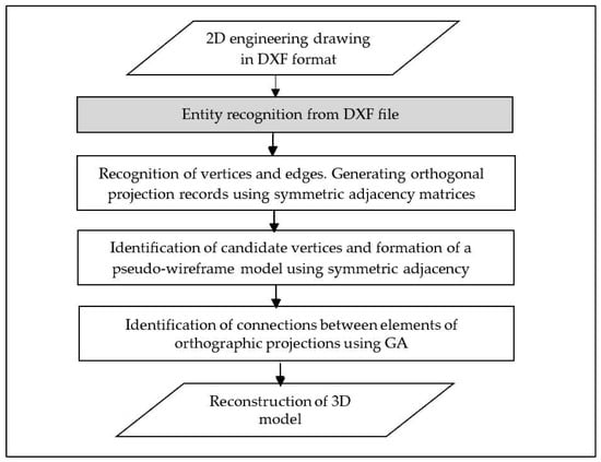 The flowchart presented in Figure 3 outlines the overall workflow of the proposed methodology, beginning with the parsing of DXF projections and culminating in the reconstruction process based on a GA. Each element of the flowchart corresponds to a specific sub-procedure, the details of which are elaborated in the subsequent sections. This modular structure ensures clarity and reproducibility, reflecting the systematic integration of geometric data processing and evolutionary optimization.