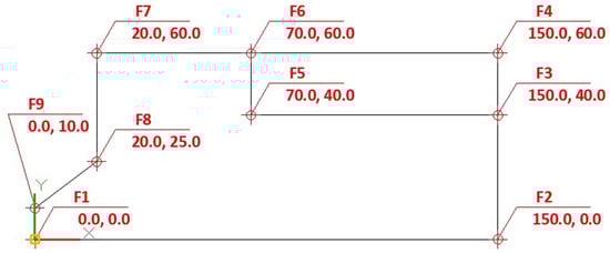 In the example shown in Figure 4, which represents the front view of the part shown in Figure 1, there are a total of 9 points that form line entities. A line is an entity determined with the starting point (X1, Y1) and the ending point (X2, Y2), i.e., the coordinates of the starting and ending points in the Cartesian coordinate system.
