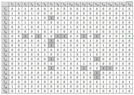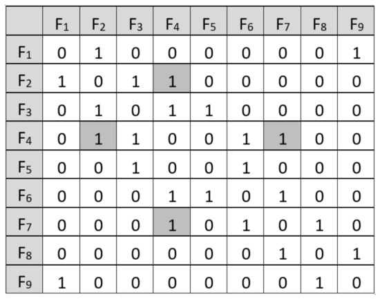 Figure 5 presents the orthogonal projection matrix for the front view shown in Figure 4. As can be seen, vertices F4–F6 form an edge, but so do vertices F4–F7. The same applies to vertices F4–F2 and F4–F3. The formula for the number of edges would hold if vertices F4–F3 and F4–F6 formed edges but F4–F7 and F4–F6 did not, and then it would be an undirected graph. However, the 3D model is unknown, and whether there is, for example, an edge F4–F7 can only be determined by considering hidden edges and a series of vertex relationship tests and calculations, which is difficult to perform for more complex models. Therefore, the assumption is introduced that the orthogonal projection matrix must include projections of all possible surfaces that the 3D model can have in a direction normal to the projection plane, which are defined for the example in Figure 4 by vertices 1-2-4-6-7-8-9, 1-2-3-5-6-7-8-9, and 3-4-6-5.