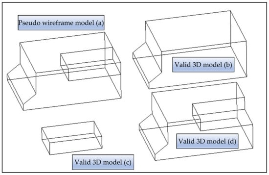 Further developments include [,,,], which introduce a hybrid model linking vertices, edges, and surfaces, later converted into B-Rep. Although informative, this method requires high computational resources due to surface relation identification in each view. Varley [] applied shortest path algorithms on graphs to detect loops corresponding to surfaces. Others, such as [,], rely on extrusion and knowledge bases but are limited to simple forms and predefined geometries.