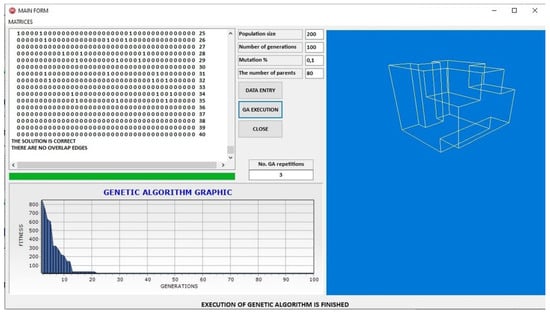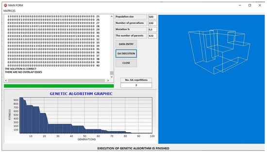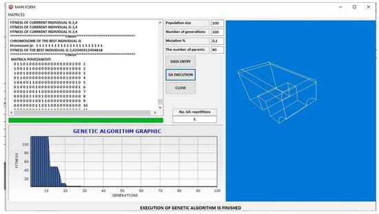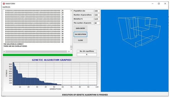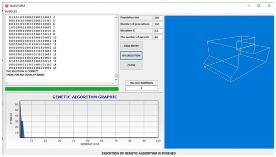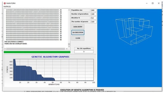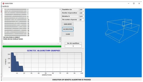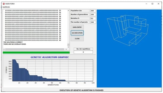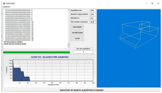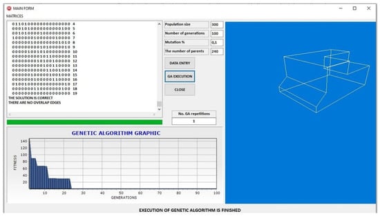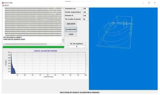 The execution time of the GA for complex parts is longer, which also depends on the amount of computation, but this is not a problem regarding the characteristics of modern computers. For example, for PR0004, the ADj matrix is 40 × 40, and intensive calculations are performed on it at all times. In this case, as well as in other more complex parts that were tested, for the number of l vertices greater than 25, solutions are always obtained where the geometric consistency is not violated and the solution does not go beyond the set of solutions represented by the pseudo-wireframe model. Also, no new surfaces are created, and there is no edge overlapping, meaning that individual candidate vertices remain in the solution because all constraints are satisfied and they do not create new shapes in the model.
