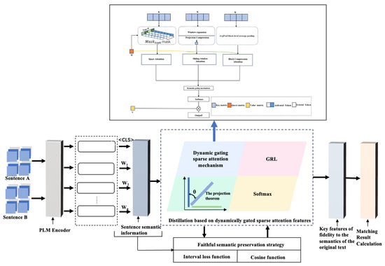 Based on this, this study innovatively proposes a dynamic gating projection sparse attention mechanism and feature distillation strategy combined with a faithful semantic preservation approach. The mechanism effectively extracts features through dynamic gated weight fusion branching, introducing linear projection to compress feature dimensions and supporting adaptive padding; the feature distillation strategy uses techniques such as dynamic gated sparse attention to accurately capture features that are weakly correlated with the matching relationship and remove noise to extract key information; and the faithful semantic preservation method ensures that the extracted features are faithful to the original text’s semantics. The methods proposed in this study are easy to combine with pre-trained language models, and their effectiveness is verified on a wide range of datasets in both specialized and general domains, further advancing the development of text matching tasks.
