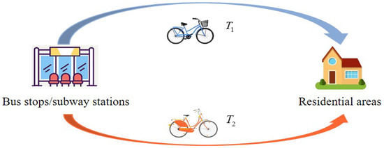 Discounts play a crucial role in promoting the use of shared bicycles, reducing carbon emissions, alleviating traffic congestion, and providing affordable transportation options to a wide range of users. Studies have shown that discounts can significantly impact ridership levels of shared bicycles [27,32,33]. Wang et al. [34] presented an optimal model for adaptive relocation costs of shared electric vehicles based on user incentives and found that the enterprise’s relocation costs were reduced by more than through these incentives. Chen et al. [35] found that the Taipei City government promotes green transportation by providing discounts to users who transfer from the MRT or bus to You Bike within a particular period. However, there is limited research on discount incentives for shared bicycles under different competitive modes.