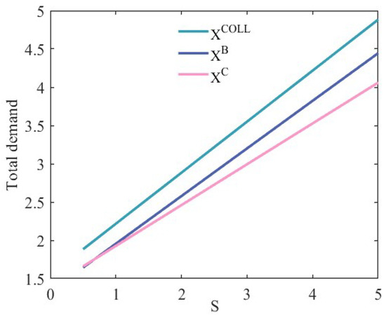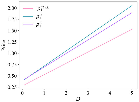 In this section, the focus will be on three different modes of competition (three scenarios): joint profit maximization (collusion), price competition (Bertrand), and potential user demand competition (Cournot), and will be driven and denoted by superscripts , B, and C, respectively. The competition among these three models is discussed in the literature [11,12,48].