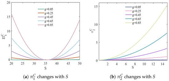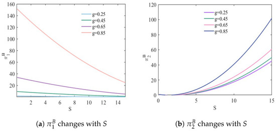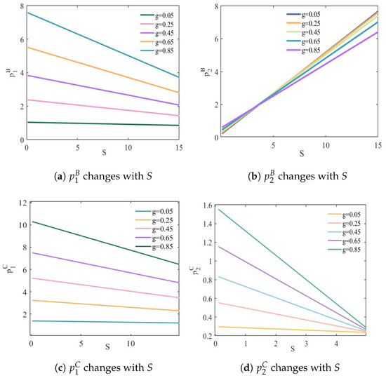 Therefore, we can conclude that, for shared bicycle operators, the marginal increase in their price always has a higher influence, in absolute terms, on their demand than on the competitor’s demand. The difference between and can be decreased when g increases, which means the two shared bicycle operators compete more fiercely.