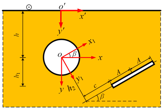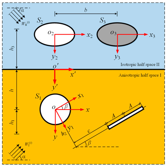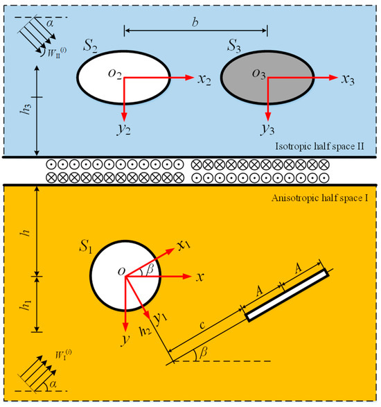 The analytical and numerical solutions derived from the aforementioned studies primarily emphasize the isotropic medium model, which holds substantial importance in modern acoustics, petroleum geophysics, explosive mechanics, and material mechanical property investigations. However, in earthquake engineering, geotechnical characteristics are often represented with models of an anisotropic medium. An anisotropic medium involves numerous independent constants, leading to highly complex scattering fields when elastic waves propagate through structures with defects or complex geometries. As a result, only a limited number of studies [26,27,28,29,30,31,32,33,34,35,36,37,38] have explored this area. Among these, the complex variables computational methodology was widely adopted. For instance, Liu and Chen et al. [26,27,28,29] applied this approach to analyze the dynamic stress concentration of cavities and the ground motion of semi-cylindrical alluvial valleys scattered by SH-wave incidence. Combined with Green’s function approach, Xu et al. further developed it to report the dynamic response of a circular cavity and crack in anisotropic elastic halfspace [30] and two cavities and a linear crack located within bonded isotropic and anisotropic half spaces [31]. Regarding crack dynamics in anisotropic media under elastic wave excitation, exact solutions were obtained using Fourier and Hubert transforms, stiffness matrix formulations, and nonlocal theory [32,33,34,35,36]. Based on a model of two semi-infinite anisotropic magnetoelastic media, Kumar et al. [37] also established precise solutions for SH-wave reflection and transmission. Additionally, the dispersion of longitudinal and transverse elastic waves in composites was investigated by modeling an anisotropic matrix with anisotropic interface layers, where the final composite consisted of an isotropic matrix containing spherical inclusions [38].
