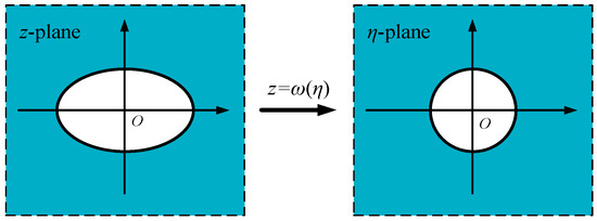 Furthermore, to facilitate the investigation of the scattering problem generated by an elliptical cavity and inclusion, the conformal mapping method is employed to transform the elliptical outland to be a unit circle boundary (in Figure 2). Inspired by the complex function method, we introduce the conformal mapping function: