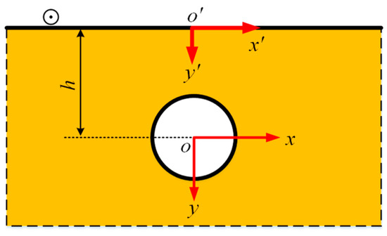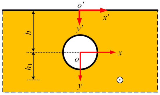 As shown in Figure 3, the first Green’s function G1 represents the displacement discipline excited by an out-plane load that impacts the surface of an anisotropic half space only containing a cylindrical cavity. G1 should satisfy Equation (17) and the boundary condition as follows: