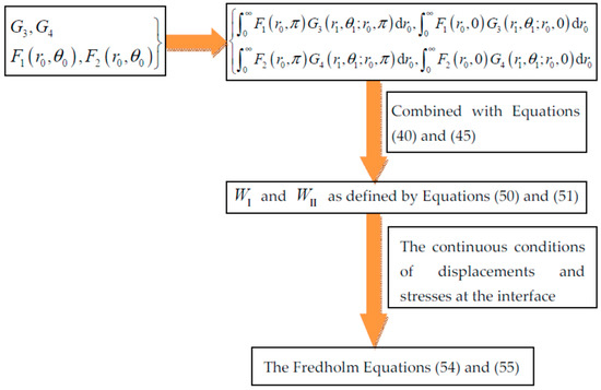 Equations (54) and (55) are a group of integral equations, and the equations are a group of Fredholm equations with weak singularity. The external forces F1 and F2 can be solved by linearizing the integral equations. The derivation can be concluded with the following flowchart shown as Figure 8: