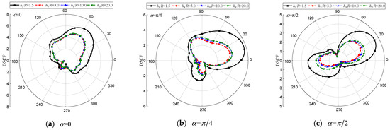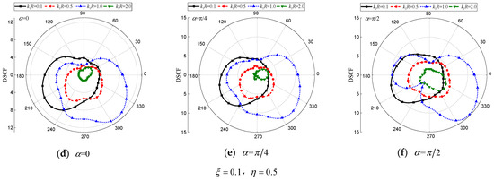Figure 9, Figure 10 and Figure 11 illustrate that the oscillation characteristics of the distribution curve become more pronounced as the incident wave number . increases. When SH waves incident horizontally or obliquely, a higher intensity of dynamic stress concentration occurs near the interface. This can be attributed to the generation of a more complex scattered wave field between the circular hole and the interface when the circular hole is shallowly buried. Moreover, in an orthogonal anisotropic medium, the propagation of incident waves exhibits directional disparities. Under vertical incidence, there is a deflection in the distribution curve around the circular cavity due to the coupling of medium characteristics of the orthogonal anisotropic medium in the and -axis for , as shown in Figure 9c,f. For the circular hole with = 0.5 and for the inclusion with = 1.0, the values of are larger compared to the other three cases.
