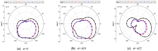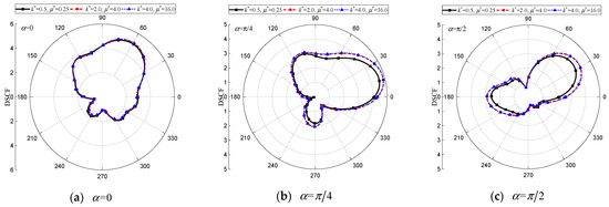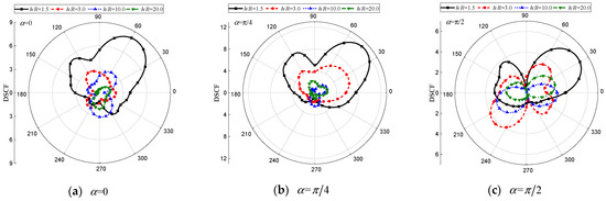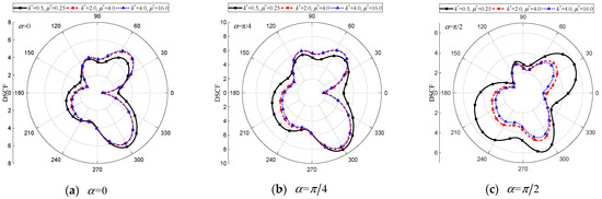 Comparison of Figure 22 and Figure 23 with Figure 21 shows that the influence of on dynamic stress concentration for the elliptical cavity and the elliptical inclusion differs significantly from that of the circular cavity. As shown in Figure 22a,b for , when the SH wave is incident either horizontally or obliquely, significant dynamic stress concentration occurs around the elliptical cavity. In contrast, this dynamic stress concentration diminishes with vertical incidence. At , a significant dynamic stress concentration occurs at the left part of the ellipse hole with a maximum value of 11.38. Analysis of Figure 23 reveals a more pronounced dynamic stress concentration around for the elliptical inclusion compared to the other three cases when , with larger values obtained as well. Furthermore, different incidence angles of SH waves also exert substantial influence on the curve depicting the dynamic stress concentration coefficient against .