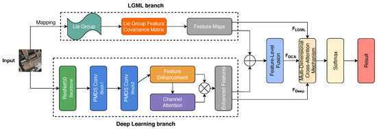 In this section, we present the proposed LGNet architecture, which addresses key challenges in RSSC through Lie group feature extraction and MD-CAM. First, we provide an overview of the overall model structure, followed by comprehensive explanations of the LGML branch, deep learning branch, MD-CAM, and feature fusion strategy design principles and implementation details. Finally, we describe our experimental setup, including datasets, implementation environment, and parameter configurations, establishing the foundation for subsequent results analysis and discussion.