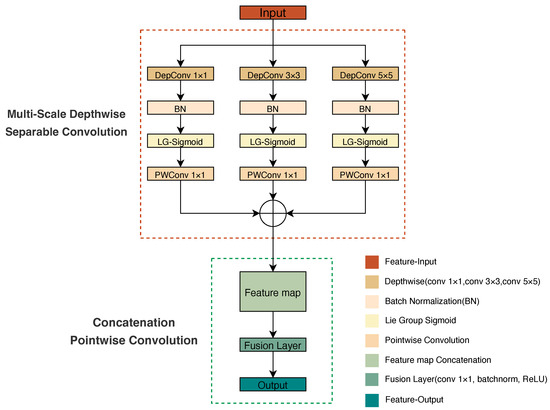 where represents the matrix trace calculation, c denotes a constant (), and is the Hermitian transpose matrix of y. This activation function is based on Lie group manifold space, providing a smooth normalization and probabilistic mapping of processed matrix samples, thus facilitating the model to obtain a more balanced, continuous, and interpretable feature distribution in subsequent feature decision processes [60,61]. Subsequently, we fuse features of different scales obtained from the three channels to capture multi-scale receptive field information. Direct concatenation would significantly increase the number of channels and reduce computational efficiency. Therefore, we employ pointwise convolution for feature refinement, combined with Batch Normalization (BN) [62] and the ReLU activation function [63] to stabilize feature distributions and enhance the model’s nonlinear representation capability.