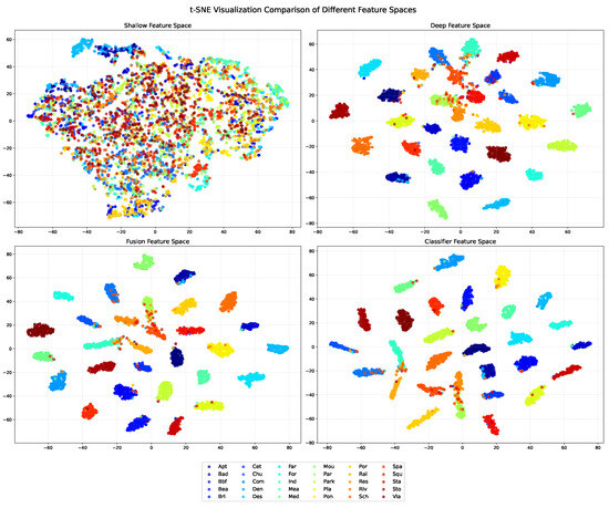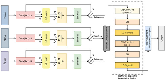 In our model design, we simultaneously input the feature map obtained from feature-level fusion, as well as the feature maps and from the LGML branch and deep learning branch, respectively, into the MD-CAM for processing. For each feature map, we generate separate Query (Q), Key (K), and Value (V) matrices through three independent convolution operations. Unlike traditional attention mechanisms, our design ensures that matrices generated from each feature layer effectively capture information at various levels without mutual interference, while reducing feature dimensionality and lowering the complexity of subsequent computations [65,66]: