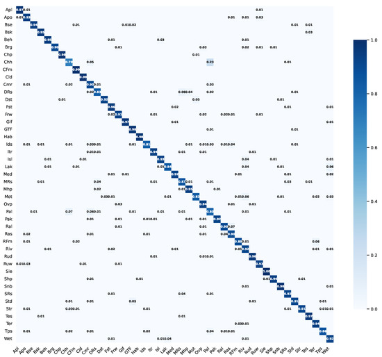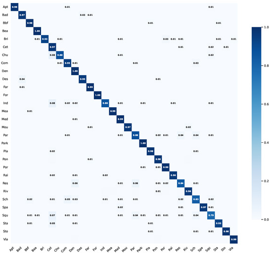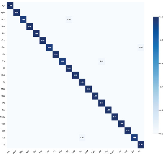 Based on previous research and experimental foundations [1,2,19], this study adopts the experimental parameters shown in Table 4. We use overall accuracy (OA) and confusion matrices (CMs) to evaluate the model’s performance. For the AID, UC Merced, and NWPU-RESISC45 datasets, we set up different training ratios: 20% and 50% for AID, 50% and 80% for UC Merced, and 10% and 20% for NWPU-RESISC45.