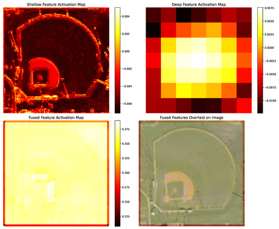 Table 2 compares computational complexity across different attention mechanisms. Traditional self-attention mechanisms have a time complexity of in HRRSI [69] (where N represents the number of tokens in the image). In contrast, the MD-CAM proposed in this study successfully reduces the overall complexity to (where d represents the number of feature channels after dimensionality reduction) by constraining global attention calculations within fixed-size local blocks. This design significantly reduces the computational overhead and preserves the independent semantic expression capability of different feature layers, enhancing cross-layer feature fusion effects while effectively avoiding the information interference between feature layers. Experimental results demonstrate that MD-CAM exhibits significant advantages in multi-feature layer fusion and dynamic attention to key regions, while notably reducing the overall computational complexity.