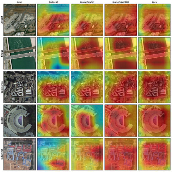 By adjusting the focus on features from different regions, the introduction of attention mechanisms enables models to concentrate on key areas or important features, thereby enhancing discriminative capabilities in complex scenes. For example, the Convolutional Block Attention Module (CBAM) proposed by Woo et al. [38] combines channel and spatial attention, and its lightweight design has brought significant performance improvements in applications across various computer vision tasks, such as image classification. The SENet model designed by Hu et al. [39] innovatively recalibrates convolutional feature maps through significant channel attention mechanisms, effectively enhancing feature representation and achieving good results in RSSC tasks. Additionally, context-related attention mechanisms further strengthen the model’s understanding of complex objects and backgrounds. Wang et al. [40] proposed a recursive attention-based model that captures the spatial relationships between features through a multi-level structure, enhancing the model’s feature representation and robustness.