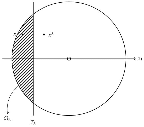 we derive a contradiction, since the plane did not reach the origin. If we take a point on the curved part , then its reflection point is in the interior of the ball, , , which contradicts (33). Therefore, (31) is proved.
