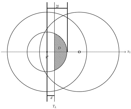 Choose a ball centered at with radius , and let , see Figure 2. Then,