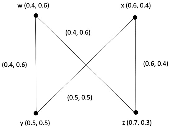 Consider an IFG given in Figure 2 in which all arcs are strong. The sets M 1 = ( w , y ) , ( x , z ) and M 2 = ( w , z ) , ( x , y ) are PSMs with the values W ( M 1 ) = ( 0.4 + 0.6 , 0.6 + 0.4 ) = ( 1.0 , 1.0 ) and W ( M 2 ) = ( 0.4 + 0.5 , 0.6 + 0.5 ) = ( 0.9 , 1.1 ) .