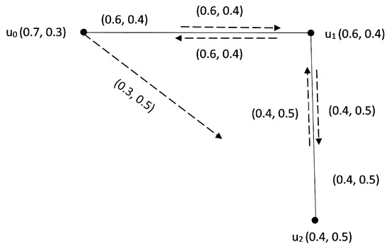Consider an IFIG G ˜ = ( V , λ , μ , ν ) as given in Figure 3. In this IFIG, we have λ ( u 0 ) = ( 0.8 , 0.2 ) , λ ( u 1 ) = ( 0.7 , 0.3 ) , λ ( u 2 ) = ( 0.6 , 0.4 ) ; μ ( u 0 , u 1 ) = ( 0.7 , 0.3 ) , μ ( u 1 , u 2 ) = ( 0.6 , 0.4 ) ; μ ( u 0 , u 0 u 1 ) = ( 0.6 , 0.2 ) , ν ( u 1 , u 1 u 2 ) = ( 0.5 , 0.2 ) and ν ( u 0 , u 1 u 2 ) = ( 0.4 , 0.2 ) . In this IFIG, there is only one I F I P ¯ from u 0 to u 1 u 2 , namely, u 0 , ( u 0 , u 1 u 2 ) , u 1 u 2 . Therefore, the influence of the path u 0 u 1 u 2 is I ( P ) = ( 0.4 , 0.2 ) , and the IC is also I C O N N ( u 0 , u 1 ) = ( 0.4 , 0.2 ) because the influence u 0 u 1 u 2 path; there is a single IFIP.