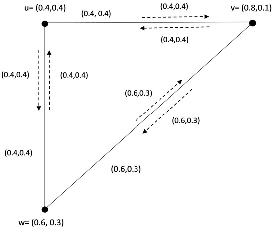 ([23]). A path in an IFIG G ˜ = ( V , λ , μ , ν ) G ˜ is called EIP if  ν α ( u 0 , u 1 u 2 ) = { λ α ( u 0 ) , μ α ( u 1 u 2 ) } and ν β ( u 0 , u 1 u 2 ) = { λ β ( u 0 ) , μ β ( u 1 u 2 ) } .