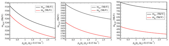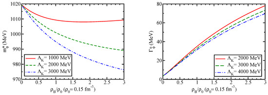 Critical to our results of the in-medium meson mass and decay width at finite baryon density , is the in-medium kaon mass . The nuclear (baryon) density dependence of the meson mass and decay width are driven by the interactions of the kaon with the nuclear medium, which enter through in the kaon propagators in Equation (12). The in-medium kaon mass was calculated previously in the QMC model, and the results are shown in the right panel of Figure 1. We note that the kaon effective mass at normal nuclear density fm−3 decreases by about [99]. We remind that, to calculate the kaon-antikaon loop contributions to the -meson self-energy in symmetric nuclear matter, the isoscalar-vector mean field potentials arise both for the kaon and antikaon. However, they have opposite signs and cancel each other, or can be eliminated by the variable shift in the loop integral calculation.