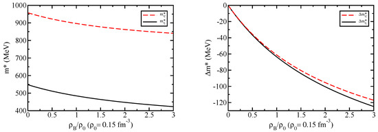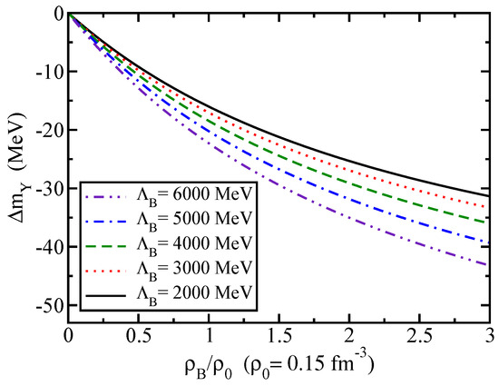 In Figure 5, we present the -meson mass shift, , as a function of the nuclear matter density, (), for four values of the cutoff parameter [72]. As can be seen from the figure, the effect of the in-medium D and mass changes is to shift the mass downwards. This is because the reduction in the D and masses enhances the -loop contribution in nuclear matter relative to that in vacuum. This effect increases the larger the cutoff mass becomes.