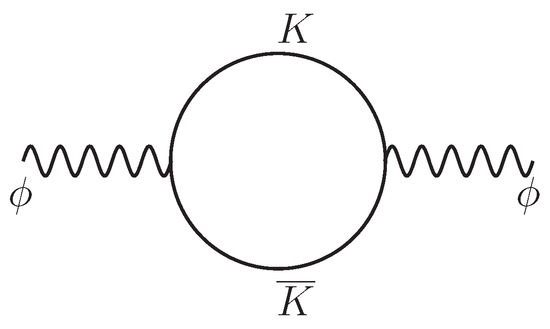 The scalar self-energy for the meson, , is determined from Equation (10). The Feynman diagram contributing to at is depicted in Figure 3. For a meson at rest, the scalar self-energy is given by