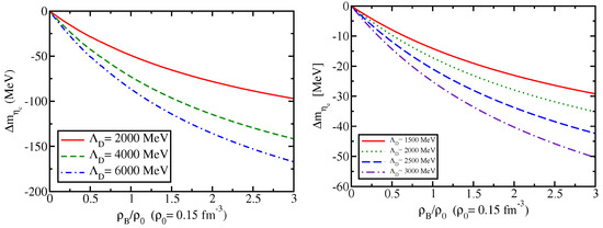 mass shift (i) with the SU(4) symmetric coupling [90], (left panel), and (ii) with the broken SU(4) symmetry coupling [72] (right panel), versus nuclear matter density for various values of the cutoff parameter.