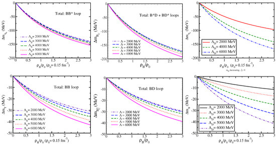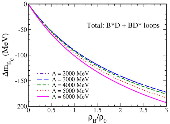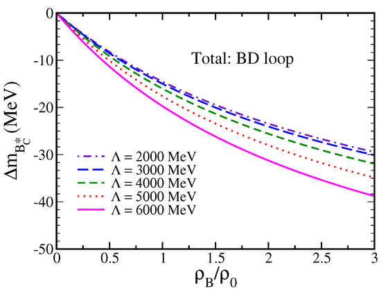 Again, see the middle panel of Figure 1; we present the medium-modified masses for the D and mesons (), calculated within the QMC model [42] as a function of . In Figure 6, we show the contribution of the -loop to the mass shift for . As the cutoff mass value increases in the form factor, the -loop contribution obviously becomes larger.