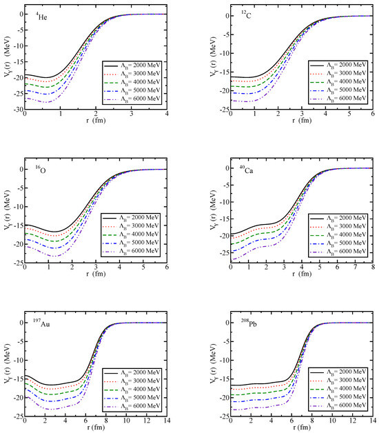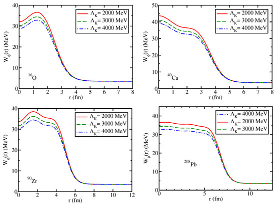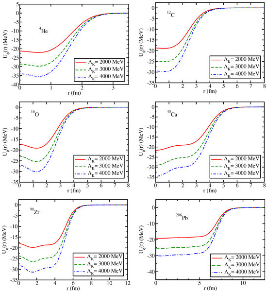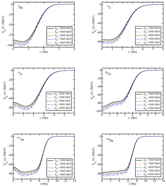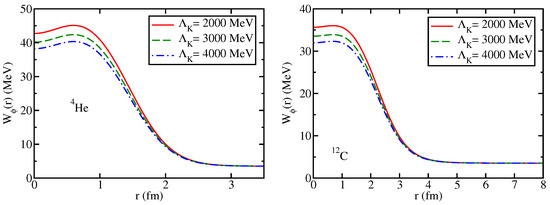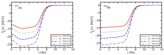 First, from the result shown in the left panel of Figure 6 without the gauge term (), one can see that the obtains the attractive potential for all the values of the cutoff , 2000–6000 MeV [105,106]. In contrast, one can see from the right panel in Figure 6, that the effect of the gauge term tends to oppose the effect (repulsion) of the contribution of the -loop as noticed in Refs. [42,105,106]. When the value of is smaller, the mass shift actually becomes positive. The results shown in Figure 6 reveal a negative mass shift (attractive potential) for the meson in symmetric nuclear matter for all values of the cutoff mass parameter when and, as in the meson case, open the possibility to study the binding of mesons to nuclei [105,106].